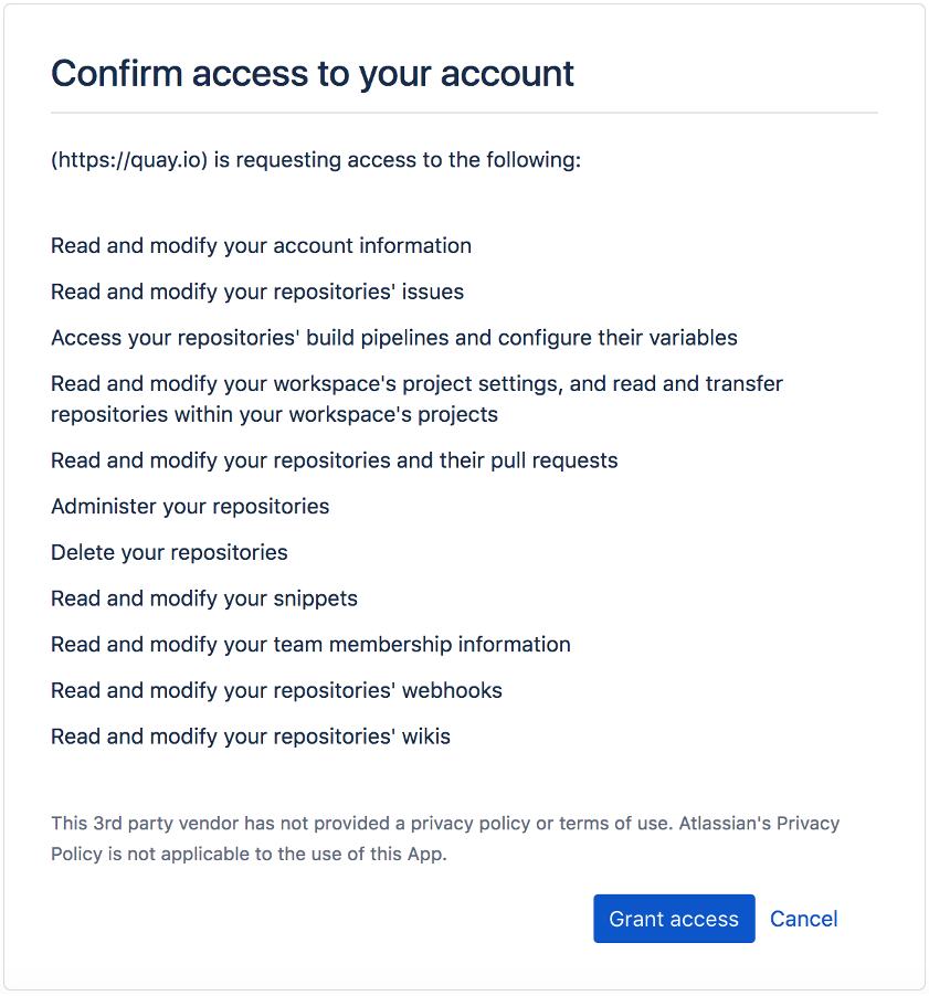 One of the first things we looked at was the integration that Quay.io already has with Bitbucket. However, the list of permissions that Quay.io requests to enable it quickly dissuaded us.
