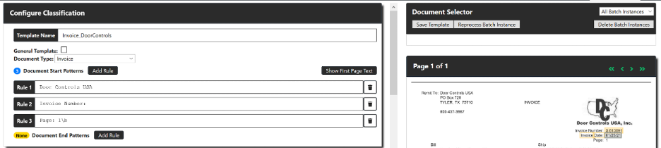 For most templates, three start patterns should be set up: the vendor (name, address, phone number, etc.), the document type, and the first page. If a good identifier of a first page isn’t available, then an end pattern should be set up instead.