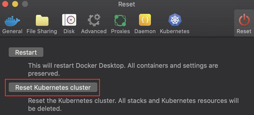 When we switch between different versions of helm charts, I have found it is safer to reset the Kubernetes cluster as highlighted in the screenshot below. Even though this is not required, I have found that this helps clear out some unexpected errors when working on multiple helm chart versions.