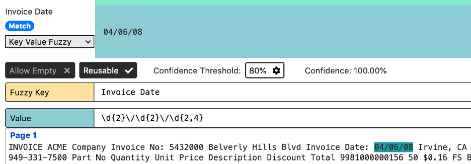 Accelerator KV extraction rules default to a regex value of .+ which means the rule will extract any text within the value rectangle. When creating templates, you should always create more specific rules for invoice numbers, date, names, etc. Using more specific rules allows for better rule reuse when creating new template extraction rules. The .+ rules extract anything. Therefore, these rules are not helpful for reuse because they will extract any text value.